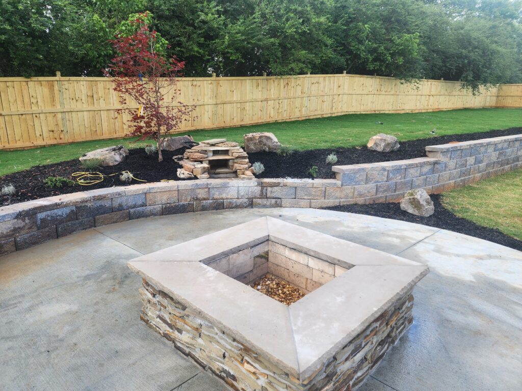 Cozy gas or wood-burning fire pits and outdoor fireplaces extend evenings with warmth and ambiance. We build integrated seating walls (paver or stone) around them for comfortable gathering—safe, code-compliant, and designed for Forsyth County weather.